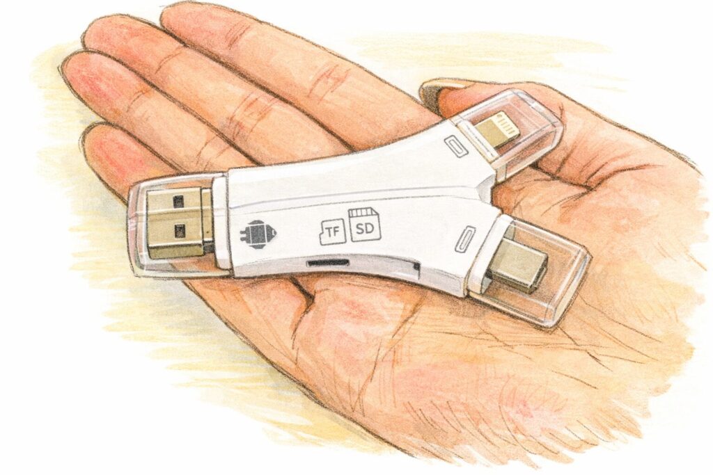 一般的なSDカードリーダーは、特定の端子にしか対応していないものが多く見られます。一方でスターフォーカス4in1は、複数の端子を備えているため、使う場面を選びにくい点が違いです。また、専用アプリを必要とせず、普段使っているファイル管理機能で操作できる点も特徴といえます。余計な手間を減らし、すぐ使えることを重視した設計が他製品との違いにつながっています。